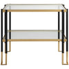 Uttermost's furniture combines premium quality materials with unique high-style design. With the advanced product engineering and packaging reinforcement, Uttermost maintains some of the lowest damage rates in the industry. Each product is designed, manufactured and packaged with shipping in mind. Featuring a clean lined solid iron frame, this contemporary table is finished in a two-toned matte black and brushed gold. Has two tempered glass shelves.