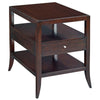 A wonderful side table with sophisticated metropolitan styling. A rectangular top is veneered with mahogany resting over four squared posts that are joined by a handy middle drawer and low shelf. Crafted from hardwood solids and mahogany veneer.