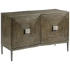 The concave front of this case is visually arresting as each receding door is centered with textured metal pull. The case stands on an artisan patina metal base. Brushed quartered oak veneer is used throughout.
