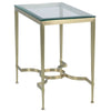 A timeless design, this table is crafted in brass and finished in brushed satin. A rectangular ½" beveled glass top rests over four gracefully tapering legs that are joined by a low, uniquely shaped stretcher.