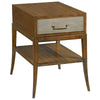 A wonderful table that is veneered with American walnut and fitted with a handy drawer that is overlaid with faux shagreen and a cast brass pull. The table is elevated by graceful tapering legs that are joined by a low shelf. Crafted from hardwood solids.