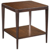 A square Mozambique veneered top with canted corners is raised by tapering posts that are joined by a low shelf.