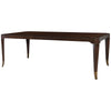 This rectangular dining room table consists of Walnut solids and Walnut veneer. Tall tapering legs are finished with brass ferrules. Brass trim accents the table apron as well as capping the tops of the legs. A book matched top includes edge banding. Finished in rich walnut. Includes two 22" leaves.