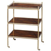 A rosewood and elegantly turned cast brass three tier étagère, the rectangular pierced repeating arch brass gallery top and brass bound lower tiers between brass columns terminating in brass castors. The original by Mallets of London. Sold at auction for $6000.